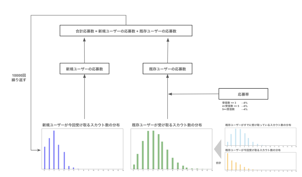 - スカウト割り当て: 1,000件のスカウトを、新規ユーザーと既存ユーザーにランダムに割り当てます。割り当てはポアソン分布を使ってランダムに行い、これによりユーザーごとに異なるスカウト受信数が割り当てられます。ここでは一旦ポアソン分布を設定していますが、実際の観測データから適切な分布を設定することが求められます。