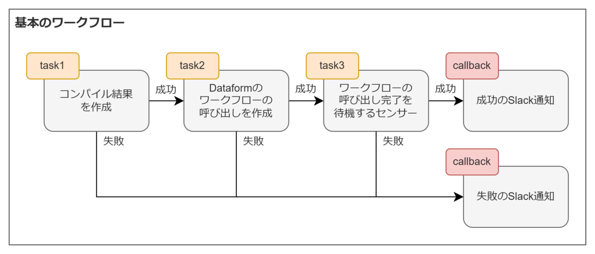 Dataformの指定のリポジトリ内のファイルをすべて実行するワークフローは、下図のように設計しました。